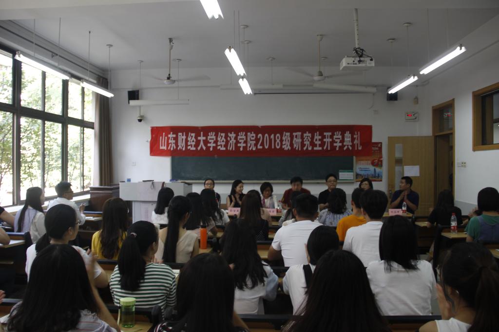 9�6日下�16:30,经济学�2018级研究生开学典礼于舜耕校区教学楼1108教室隆重举行。院长董长瑞,党委书记姜伟,副院长王传荣、彭留英、齐杨,学工办主任周新秀,研究生秘书刘应涛和教师代表崔宝敏出席会议�2018级全体研究生到场参会,会议由彭留英主持�